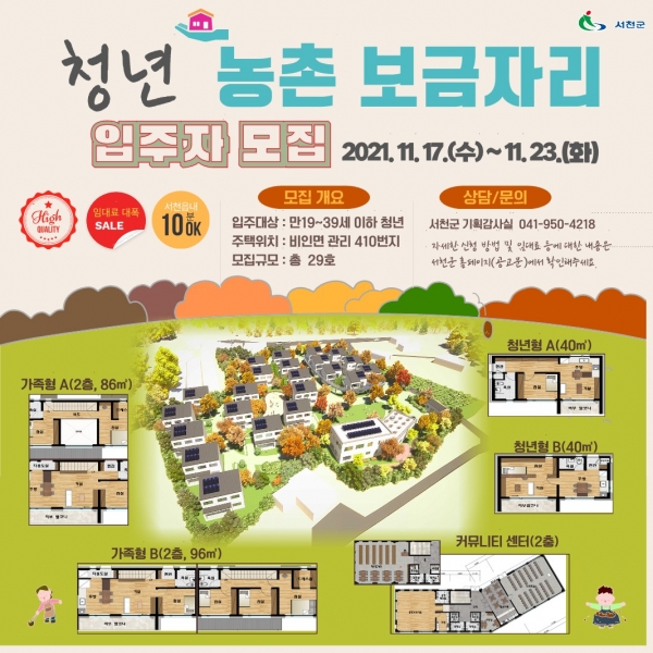 [충청뉴스큐] 서천군은 청년층의 귀농귀촌을 촉진하고 안정적인 청년 주거사다리 지원을 위해 다음달 13일부터 19일까지 비인면에 소재한 청년 농촌 보금자리 주택 입주자를 모집한다.