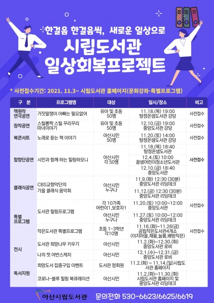 [충청뉴스큐] 아산시가 11월부터 시민들의 단계적 일상 회복을 돕고 독서문화를 장려하기 위한 ‘시립도서관 일상회복 프로젝트’를 추진 중이다.