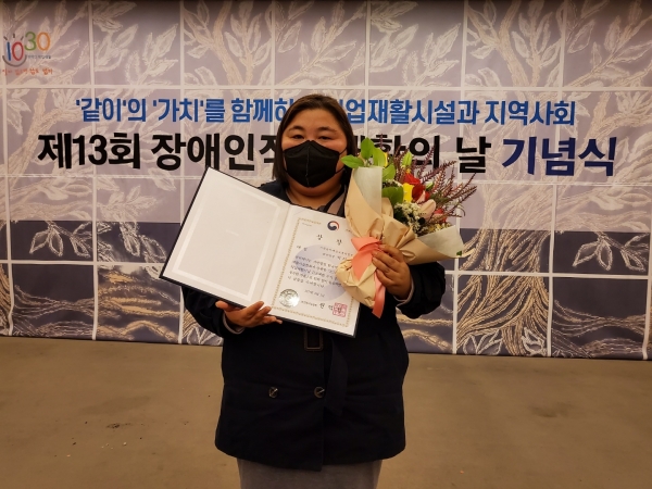대상을 받은 박지혜 씨는 서천군장애인보호작업장에서 10여 년간 성실하게 근무하고 있는 중증장애인으로 “상을 받을 것이라 예상하지 못했는데 대상이라는 큰상을 받게 되어 너무 행복하다”며 소감을 전했다.