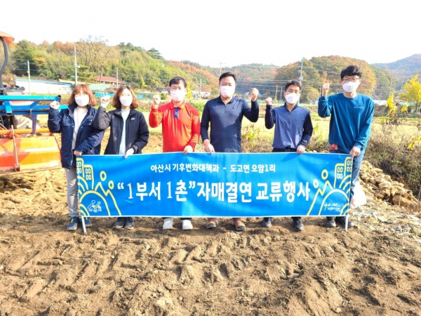 [충청뉴스큐] 아산시 기후변화대책과가 지난 4일 1부서 1촌 자매결연 마을에서 농촌일손돕기 활동을 펼쳤다.