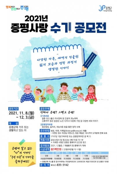 이번 공모전은 증평에 살고 있는 다양한 가족, 세대의 진솔한 삶의 모습과 정착 과정의 생생한 이야기를 담은 사례를 공유하고 살고 싶은 증평을 알려 인구절벽과 저출산 고령사회에 대응하기 위해 마련됐다.