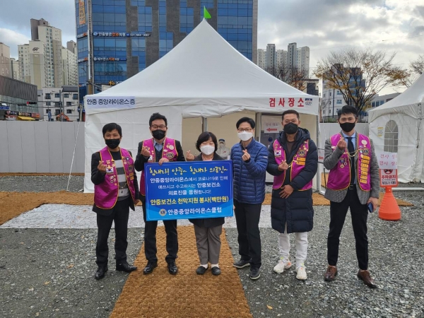 [충청뉴스큐] 평택시는 지난 8일 안중중앙라이온스클럽에서 안중공용버스터미널 부지로 이전한 안중보건지소 선별진료소에 코로나19 검사 시 추위를 막을수 있는 몽골텐트를 기증하고 코로나19 장기화로 고생하고 있는 직원들을 격려했다고 밝혔다 이회장은 “기증된 물품이 한겨울의 매서운 추위와 함께할 선별진료소 근무자들의 근무여건 개선에 도움이 되길 바란다”며“앞으로도 코로나 19 확산방지를 위해 힘써 주실 것”을 당부했다.
