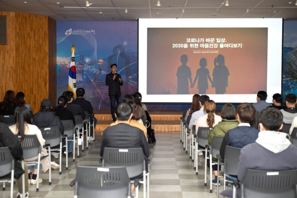 이날 강연은 ‘코로나가 바꾼 일상: 2030을 위한 마음건강 들여다보기’를 주제로 코로나19 장기화로 인해 일상이 변화한 요즘, 청년 세대의 마음건강 상태를 살펴보는 내용으로 청년정책동아리원을 비롯한 60여명의 청년들이 참석해 마음 치유의 시간을 가졌다.