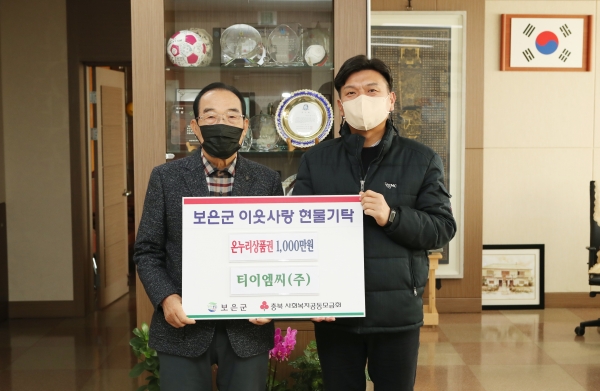 이 날 기탁된 온누리상품권은 티이엠씨가 SK하이닉스로부터 2021년 동반성장DAY 우수협력사로 선정돼 받은 수상품으로 보은군내 가정위탁아동에게 전달될 예정이다.