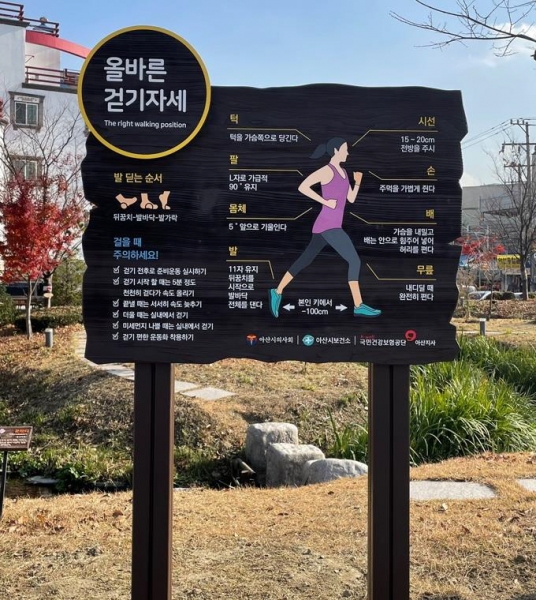 아산시보건소, 아산시 의사회, 국민건강보험공단 아산지사는 올바른 건강걷기를 통한 효과적인 건강실천 활동을 도모하고자 시민들이 많이 걷는 장소인 은행나무길, 온천천길, 남산길 3곳에 걷기 운동에 유용한 정보를 담은 올바른 건강걷기 안내표지판을 설치했다.