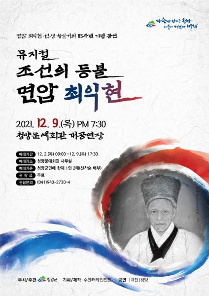 [충청뉴스큐] 청양군이 오는 9일 면암 최익현 선생의 항일 의병운동 업적을 담은 뮤지컬 ‘조선의 등불 면암 최익현’을 청양문예회관 대공연장 무대에 올린다.