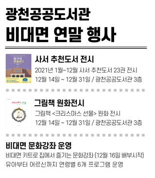 [충청뉴스큐] 홍성군은 연말을 맞아 광천공공도서관에서 오는 12월 31일까지 도서 및 원화 전시프로그램, 비대면 체험 프로그램 등 다양한 행사를 운영한다.