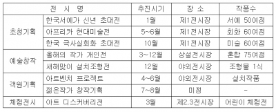 이어 3월에는 그림 도구와 재료들로 미술의 기본지식을 체험하는 어린이 전시인"아트 디스커버리전", 5월에는 글로벌한 현대미술 경향을 짚어보고 대표 작가와 작품들을 시민들에게 소개하는 초청기획전시"아프리카 현대미술전"등이 마련될 예정이다.