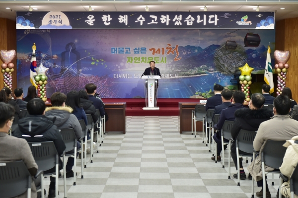 [충청뉴스큐] 제천시는 31일 한해를 마무리 짓는 2021년 종무식을 개최 했다 행사는 코로나19 방역지침에 따라 백신접종을 완료한 주요 수상자 등 최소한의 인원이 참석한 가운데 진행됐으며 그 외 시 직원들은 영상으로 시청했다.