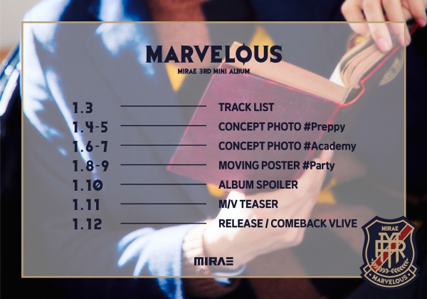 교복을 입고 책을 들고 있는 학생, 학교를 배경과 미니앨범 ‘MARVELOUS’ 엠블럼은 5일부터 공개 예정인 콘셉트 포토 #Preppy, #Academy와 연결돼 팬들의 궁금증을 한껏 높였다.