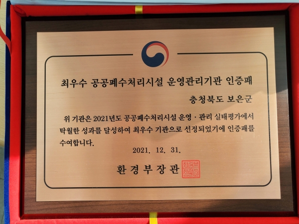 [충청뉴스큐] 보은군은 환경부에서 실시한 ‘2021년도 공공폐수처리시설 운영·관리실태 평가' 에서 최우수 지자체에 선정됐다고 지난 10일 밝혔다.