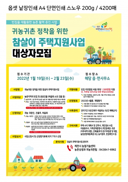 신청은 오는 2월 23일까지 해당 읍·면 행정복지센터를 통해 할 수 있으며 지원금액은 작년보다 상향된 호당 최대 1,500만원, 총 7가구를 지원할 계획이라고 전했다.