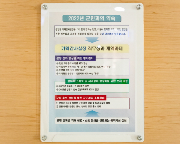 [충청뉴스큐] 청양군 소속 5급 이상 공무원들이 직무성과 계약과제 현황판을 제작, 각 부서 사무실 입구에 부착하고 군민과의 약속 지키기에 나섰다.