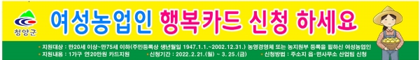 [충청뉴스큐] 청양군이 오는 21일부터 3월 25일까지 군내 여성농업인들의 문화생활을 지원하기 위한 ‘여성농업인 행복카드’ 신청자를 접수한다.