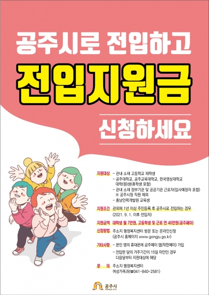 시는 전입 대학생의 안정적인 지역 정착을 지원하기 위해 관내 대학교에 재학 중인 전입 청년들에게 월 7만원씩 연 최대 84만원의 전입지원금을 지원한다.
