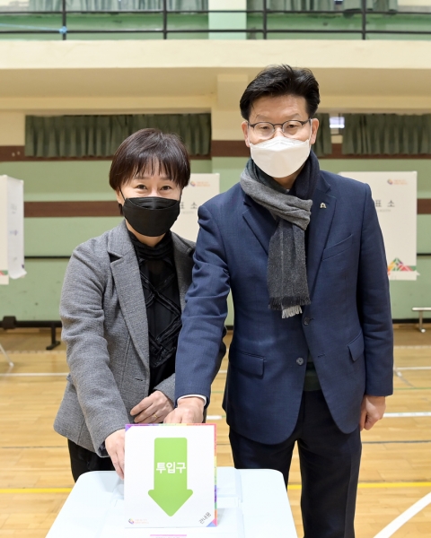 김 시장은 사전투표 첫날인 이날 오전 8시경 부인 곽현실 씨와 신관동 사전투표장을 찾아 한 표를 행사하고 투표 종사자들을 격려했다.