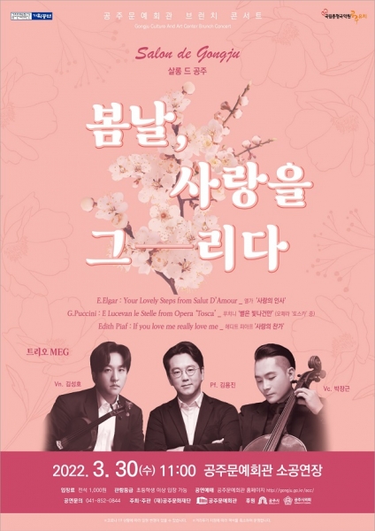 공주문예회관의 브런치 콘서트인 ‘살롱 드 공주’는 지역민들의 문화예술 저변 확대를 위해 실내악 위주의 공연으로 진행되고 있으며 ‘봄날, 사랑을 그리다’ 는 2022년 첫 번째 살롱 드 공주 공연이다.