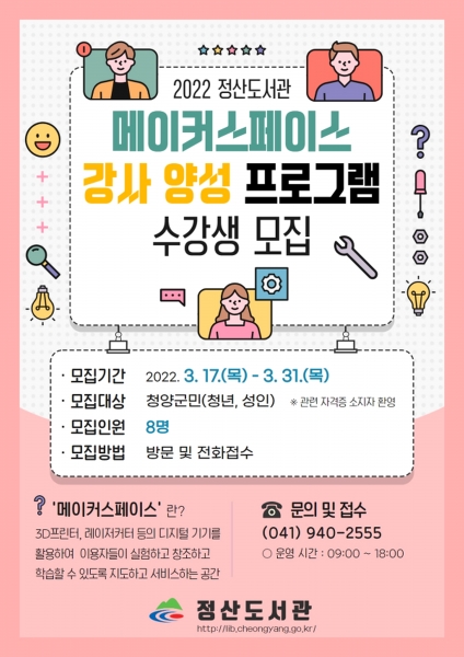 [충청뉴스큐] 청양군 정산도서관이 오는 31일까지 ‘메이커스페이스 강사양성 프로그램’ 수강생을 모집한다고 17일 밝혔다.