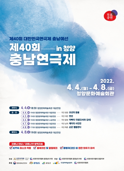이번 연극제에는 극단 ‘청양’, 극단 ‘대천’, 극단 ‘울림’, 극단 ‘날개’, 극단 ‘예촌’ 등 5개 단체가 참가해 열띤 경연을 벌일 예정으로 대상 수상팀은 오는 5월 밀양에서 열리는 ‘제40회 대한민국연극제’에 충남 대표로 참가하게 된다.