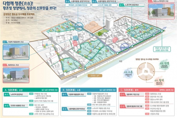 본 사업은 ‘다함께 청춘, 황혼빛 청양에서 청춘의 신호탄을 쏘다’ 라는 비전 아래 정주환경 조성 사업, 소통문화 거점조성 사업, 함께하는 공동체 조성 사업 등 3개 부문 16개 사업으로 진행된다.