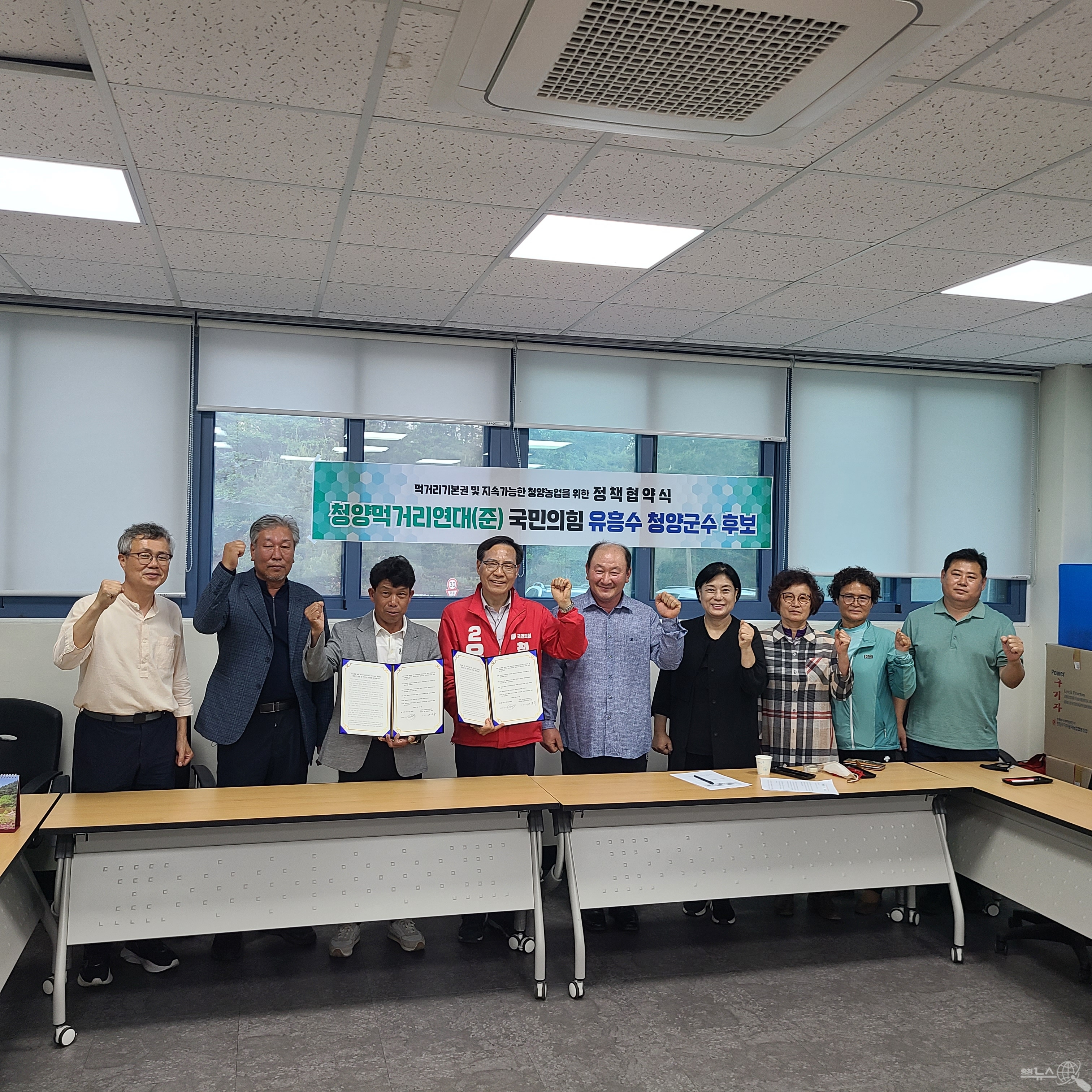 청양먹거리연대(준)와 국민의 힘 유흥수 군수 후보가 지난 24일 먹거리기본권과 청양농업을 위한 정책협약식을 가졌다.