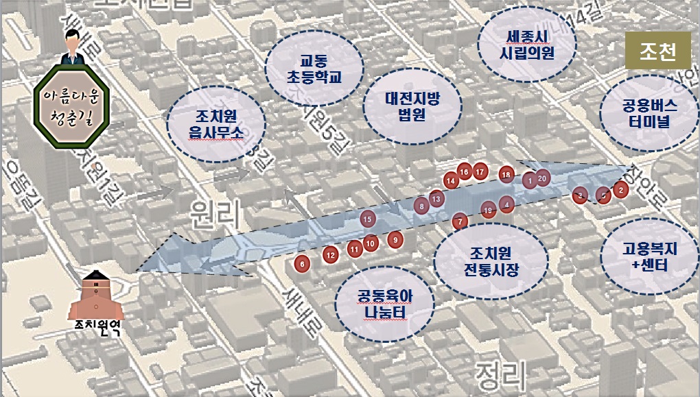 세종특별자치시 조치원로 상가밀집 지역이 행전안전부에서 주관하는 ‘2019년 간판개선사업’ 대상지에 선정, 국비 1억 8000만 원을 지원받는다. 행안부의 간판개선사업은 지난 2012년부터 지자체 공모를 통해 매년 사업 대상지 20곳 내외를 선정해 지원하는 사업으로, 세종시는 이번에 최초로 대상지에 선정됐다. 시는 사업공모를 위해 지난 3월 16일 사전 설명회를 통해 희망 지역을 조사했으며, 조치원로를 포함해 참여를 희망하는 5개 지역에 대해 주민 협의체를 구성해 주민활동을 지원했다. 행안부의 사업지역 평가를 거쳐 사업 대상지로 선정된 조치원로 상가밀집 지역은 20년 이상 노후건물 비율이 83.9%나 되고 각종 불법 광고물이 무질서하게 난립해 있어 정비가 시급한 지역으로 꼽힌다. 특히 이번 공모과정에서 조치원로는 청춘조치원프로젝트를 통해 전선지중화, 보행환경 개선, 노후 보도블럭 및 배수로 교체 사업을 주민주도로 추진·완료한 점에서 높은 평가를 받았다. 시는 이번 선정으로 조치원로의 무질서한 간판이 특색 있는 아름다운 간판으로 탈바꿈해 쾌적한 주민생활공간 조성은 물론, 상권활성화 및 지역발전 기반 확충에도 기여할 수 있을 것으로 기대하고 있다. 특히 사업추진 시 주민협의회를 통해 사업 전반에 걸친 의견수렴 및 간판디자인, 사업방향을 결정하고, 노후 건물 입면개선 등 경관 및 환경 개선도 병행 추진할 방침이다. 김규범 건축과장은 “간판개선 사업은 문화를 만드는 사업으로 청춘조치원프로젝트로 추진하는 도시재생뉴딜과 연계하여 복합적으로 추진될 때 효과가 클 것”이라며 “앞으로 올해와 마찬가지로 주민활동지원을 통해 매년 간판개선 사업 대상지를 늘린다는 계획”이라고 말했다.