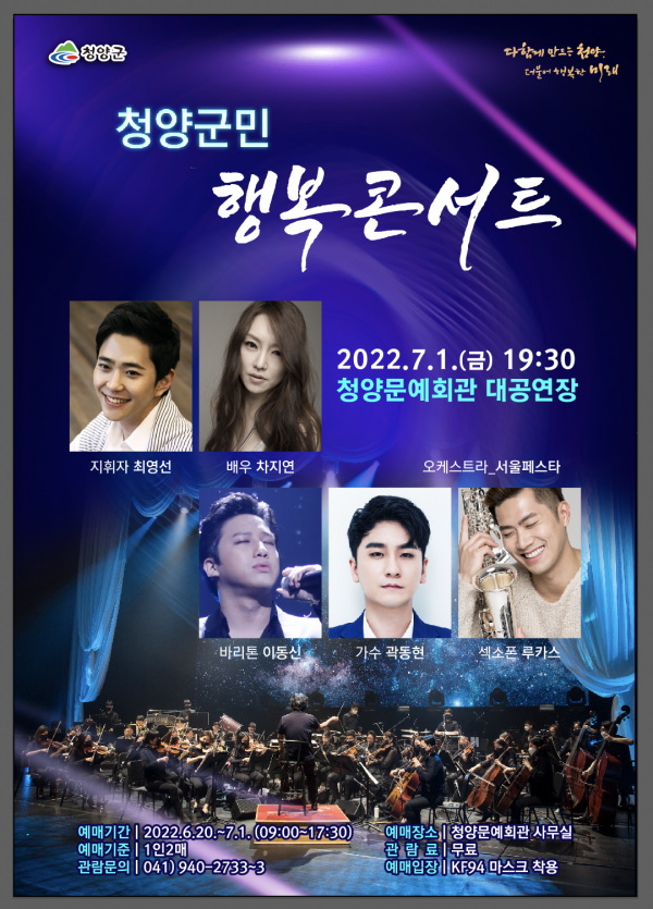 [충청뉴스큐] 청양군은 군민의 소통과 화합을 담은 ‘청양군민 행복 콘서트’를 오는 7월 1일 저녁 7시 30분 청양문예회관 대공연에서 개최한다.