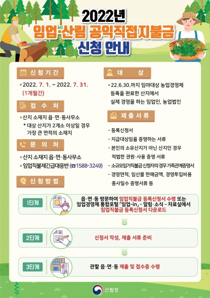 지급 대상은 산지에서 임업을 실제 경영하고 있는 임업인과 농업법인으로 6월 30일까지 임업경영체 등록을 완료해야 한다.