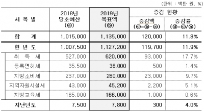 [충청뉴스큐] 강원도는 매년 늘어나는 재정 수요에 적극 대처하기 위해 금년도 도세 징수목표액을 지난해 당초 예산 대비 1,200억 원 증가한 1조 1,350억 원으로 설정했다.