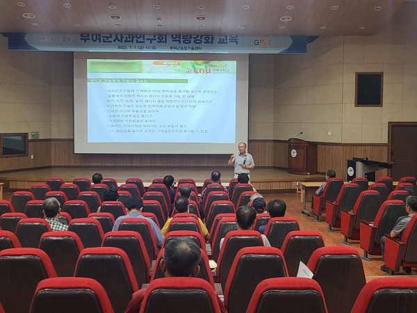 [충청뉴스큐] 부여군은 지난 1일 농업기술센터 대강당에서 사과 연구회원 60명을 대상으로 품목조직 활성화와 사과 재배기술 다변화를 위한 ‘부여군사과연구회’ 역량강화 교육을 추진했다.