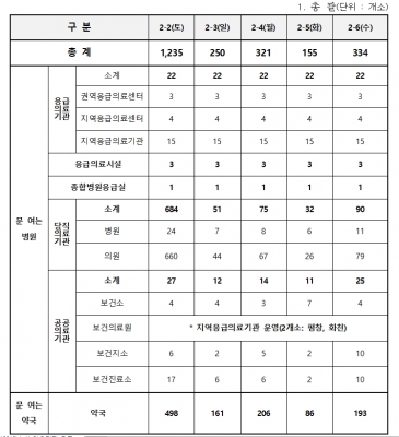 연휴기간 중 응급진료에는 병·의원 1,151개소 및 약국 1,144개소 등 총 2,295개소가 참여하며, 도내 26개소 응급의료기관은 평상시와 같이 24시간 응급실을 운영한다.