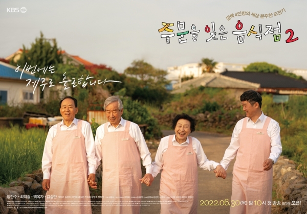 ‘주문을 잊은 음식점2’는 경증 치매인 ‘깜빡 4인방’이 힐링의 섬 제주에서 주문을 깜빡해도 음식이 잘못 나와도 웃음으로 무장 해제되는 세상에 단 하나뿐인 음식점 운영에 나서는 유쾌한 도전기를 담는 리얼리티다.