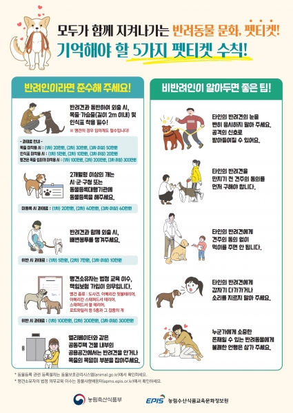 시는 반려동물 목줄·가슴줄 착용 준수 반려동물 등록 배변 수거 봉투 지참 맹견 소유자의 법정교육 이수 및 책임보험 의무가입 동물학대 금지 등 펫티켓 준수 홍보를 진행했다.