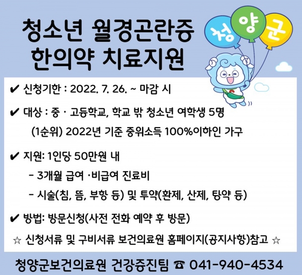 [충청뉴스큐] 청양군보건의료원(원장 김상경)이 월경곤란증으로 어려움을 겪는 여성 청소년들을 위해 한의약 치료지원 사업을 추진한다고 25일 밝혔다.