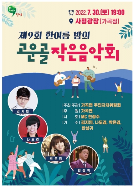 단양군 가곡면은 다가오는 30일 사평리 가곡정 일원에서 무더위를 시원하게 날려줄 ‘한여름 밤의 고운골 작은 음악회’를 연다고 지난 26일 밝혔다.