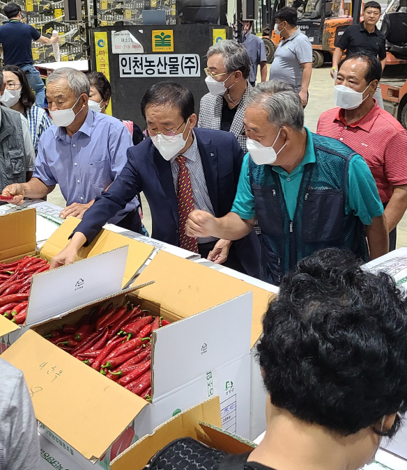 군에 따르면 김 군수는 지난 10일 이른 새벽 인천 농산물도매시장을 방문해 단양 홍고추출하에 따른 경매 현장을 방문하고 관계자들을 격려했다.