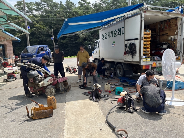 농업기술센터가 파견한 1차 수리반은 피해가 컸던 남양면 온직리와 장평면 화산리, 낙지리를 찾아가 관리기, 예초기, 분무기 등 100여 대를 수리하고 현장 수리가 어려운 대형장비는 전문 정비를 받을 수 있도록 업체와 연결했다.
