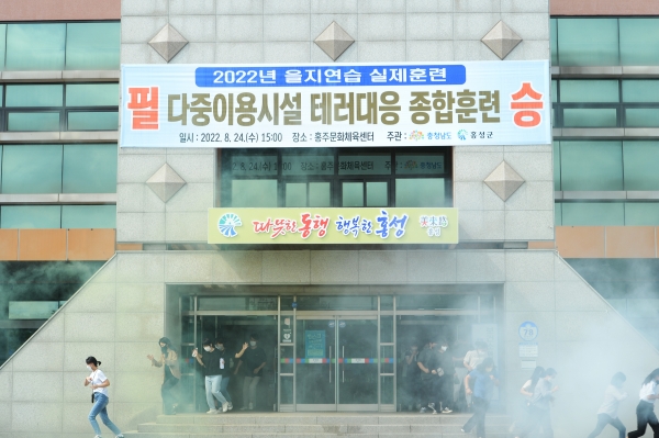 [충청뉴스큐] 홍성군은 지난 24일 홍주문화체육센터에 테러범의 폭발물 투척으로 폭발이 일어나 건물이 일부 파손되고 총기 난사 및 화재로 사상자가 발생한 급박한 상황을 가정 2022년 을지연습 테러 대응 종합훈련이 실시했다.