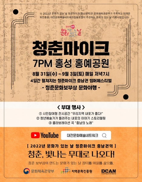 한편 이번 공연은‘2022년 문화가 있는 날 청춘마이크 충남권역’사업으로 문화체육관광부가 주최하고 지역문화진흥원, 대전문화예술네트워크협동조합이 공동 주관하며 5월부터 11월까지 매달 마지막 주 ‘문화가 있는 날’ 주간에 충청남도 일대에서 진행될 예정이다.