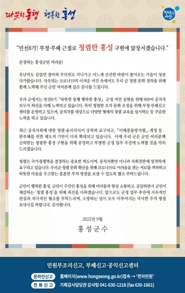 [충청뉴스큐] 홍성군은 추석 명절 연휴 맞이 청렴한 홍성 구현을 위해 군의 의지와 노력을 담은 ‘청렴 서한문’을 발송했다고 밝혔다.