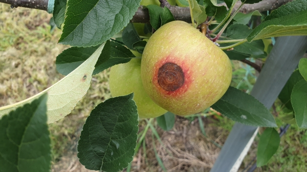 탄저병은 출하를 앞둔 홍로 품종에 집중되는 양상을 보이는데, 과실 표면에 갈색의 작은 반점이 형성되고 반점이 점차 확대되면서 병반 중앙부가 움푹해지며 과육이 씨방을 향해 썩어들어가는 병이다.