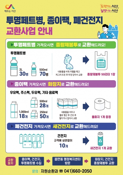 [충청뉴스큐] 충남 서산시가 투명페트병 분리배출 문화 정착을 위해 투명페트병 교환사업을 시행한다.