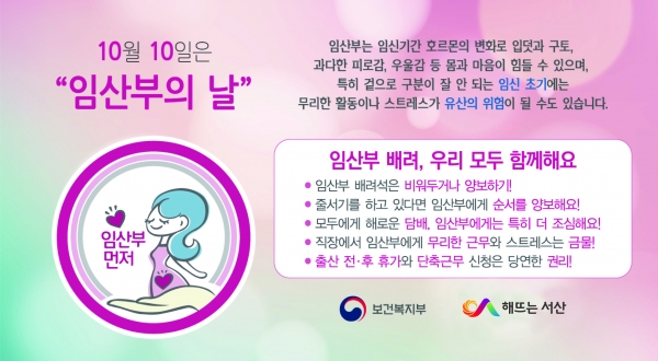 임산부의 날은 풍요와 수확의 달인 10월과 임신기간인 10개월을 의미하는 날로 임신과 출산에 대한 긍정적인 인식을 통해 저출산을 극복하고 임산부를 배려, 보호하는 사회적 분위기를 만들기 위해 제정된 법정기념일이다.