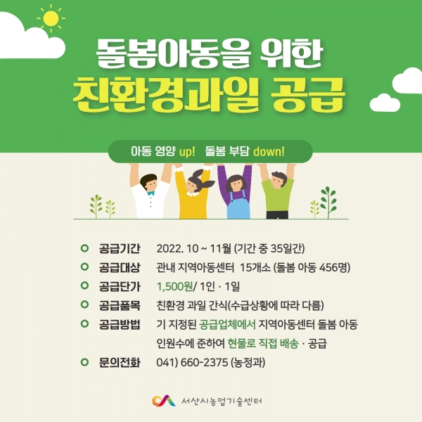 [충청뉴스큐] 충남 서산시가 오는 10월부터 관내 지역아동센터 돌봄 아동을 대상으로 친환경 제철 과일간식 공급에 나선다.
