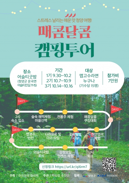 ‘맵 고수’ 누구나 참여할 수 있는 매콤달콤 캠핑 투어 기수당 인원은 15명이고 참가비는 7만원이다.