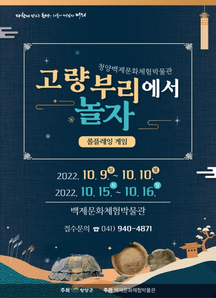 5일 군에 따르면 이번 행사는 어린이와 학생은 물론 성인도 참여할 수 있고 ‘청양의 문, 무, 미의 시간여행’을 주제로 박물관 전시실을 상징하는 캐릭터들과의 롤플레잉 게임 방식 체험활동을 통해 백제 역사와 백제 속 청양에 대한 생생한 이해를 돕는다.