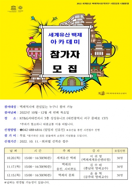 [충청뉴스큐] 백제세계유산센터가 세계유산 백제역사유적지구 및 백제의 역사와 문화를 주제로 오는 12월까지 월 1회 ‘세계유산 백제 아카데미’를 운영한다.