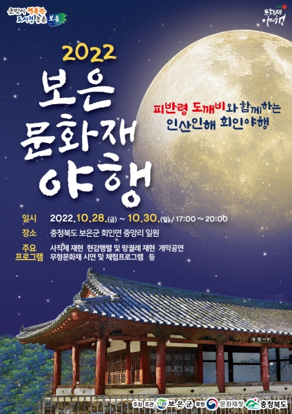 [충청뉴스큐] 보은군은 오는 28일부터 30일까지 3일간 회인면 중앙리 일원에서 문화재야행 사업인‘피반령 도깨비와 함께하는 인산인해 회인야행’을 개최한다고 25일 밝혔다.
