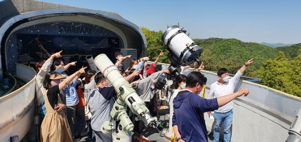 8일 군에 따르면 이번 행사는 칠갑산천문대가 보유한 천체망원경으로 태양의 흑점과 홍염을 관측하는 주간 프로그램, 밤하늘 별자리를 알아보는 야간 프로그램, 우주에 대한 무한한 상상력을 키워주는 천체투영실 프로그램으로 구성됐다.