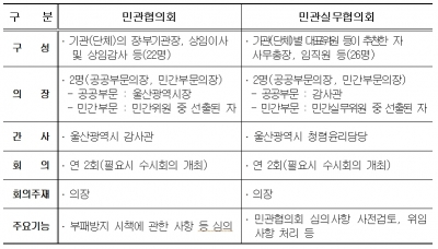 ‘청렴사회민관협의회’는 지역사회 청렴문화 분위기 조성과 확산을 위해 공공기관뿐만 아니라 시민사회, 경제, 언론, 직능단체 대표가 참여하는 기구로 2018년 7월 26일 제정 공포된‘울산광역시 청렴사회 민관협의회의 설치 및 운영에 관한 조례’에 따라 구성됐다.